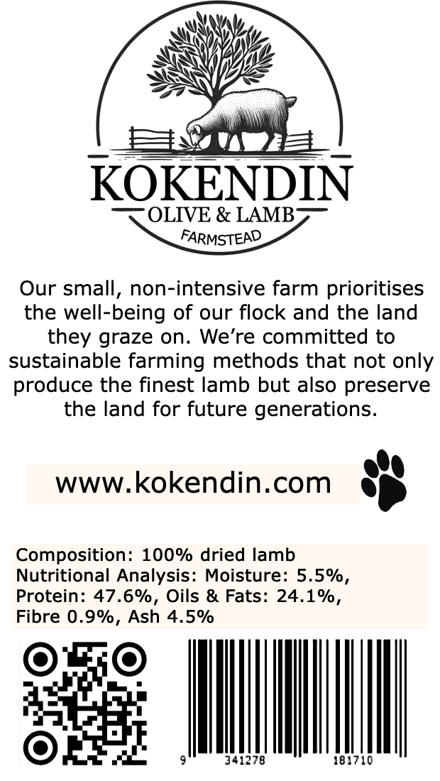 Kokendin Olive & Lamb Farmstead's Lamb Jerky is made from 100% lamb and nothing else. These tasty lamb bites can be fed whole or broken down into smaller pieces to use as high value training treats. Suitable for dogs with sensitive stomachs as they contain only 100% meat with no artificial colours or preservatives.